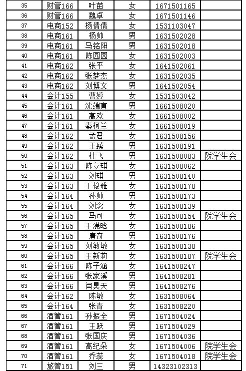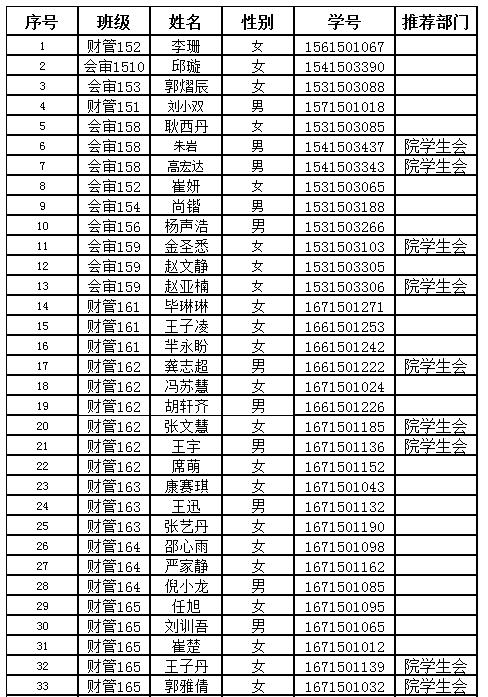 经各团支部、学生会、自管会、社团联合会考察,推荐以下同学参加hjcvip黄金城党总支学生党支部拟于近期开展的入党积极分子培训班。公示时间为2016年11月30日至12月2日(注:期限为3天)。如有问题,欢迎老师、同学通过来人、来电等方式在公示期内向hjcvip黄金城党总支学生党支部反映。反映问题应实事求是,客观公正。反映人须提供真实姓名和联系电话,以示负责。党组织将对反映人和反映情况严格保密。对经查确认反映问题属实,不符合推荐条件的,不予批准列为入党积极分子。