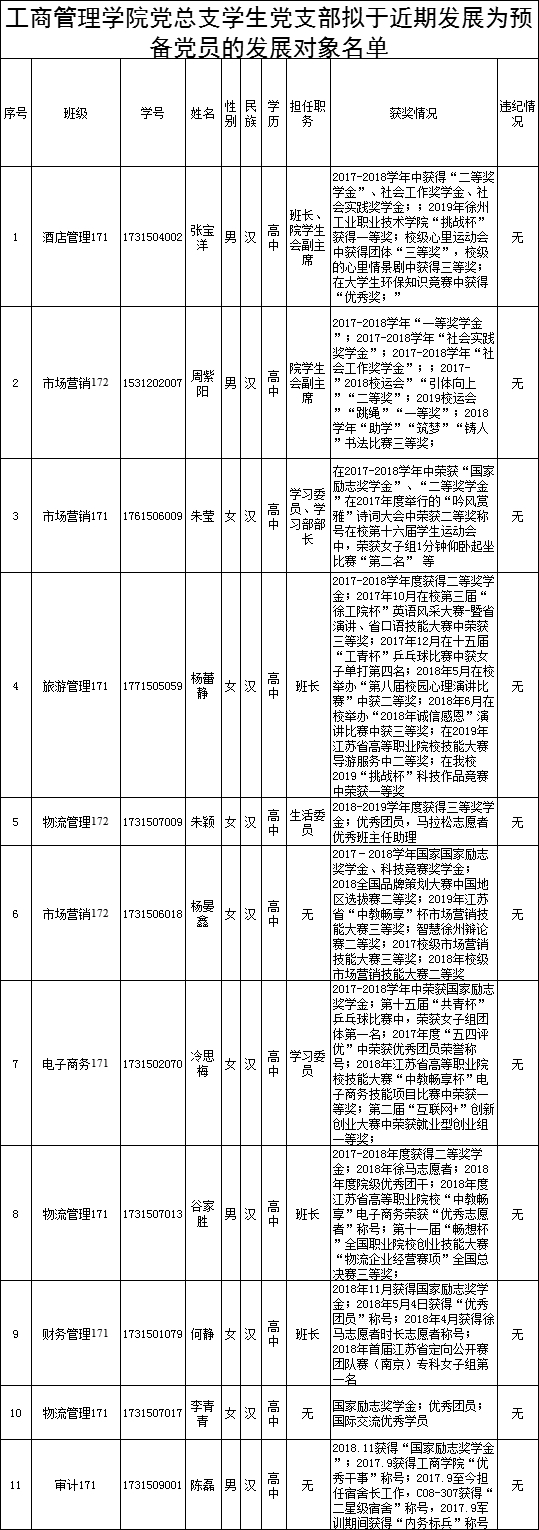 经基层党组织考察培养,以下同学被列为hjcvip黄金城党总支学生党支部拟于近期发 展为预备党员的发展对象。公示时间为2019年6月5日至6月11日(注:期限为7天)。如有问题,欢迎老师、同学通过来人、来电、来邮等方式在公示期内向hjcvip黄金城党总支或学院党委组织部反映。反映问题应实事求是,客观公正。反映人须提供真实姓名和联系电话,以示负责。党组织将对反映人和反映情况严格保密。对经查确认反映问题属实,不符合发展条件的,不予批准接收其为中共预备党员.