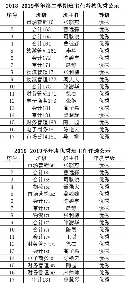 2018-2019学年优秀班主任和2018-2019-2学期优秀班主任考核公示