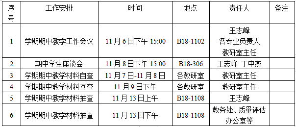 1、11月6日在B18-1102室召开本学期期中教学工作会议,安排期中教学检查相关工作,要求各专业负责人和教研室主任必须参加。
