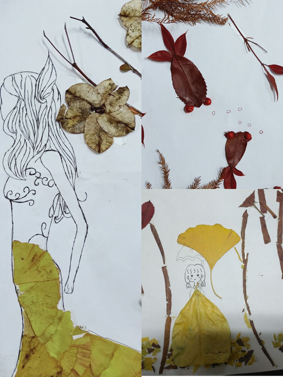 活动期间,同学们在校园各处挑拣落叶,用胶水把树叶粘在纸上。工商学子创意十足,收到的作品中有:翩翩起舞的芭蕾舞者赋有舞蹈艺术;孔雀开屏美丽富于异国情调;栩栩如生的金鱼嬉水图象征着即将跨越“龙门”,金鲤鱼为目标而不懈努力;拥抱自然的人们象征着人与自然和平相处等等。