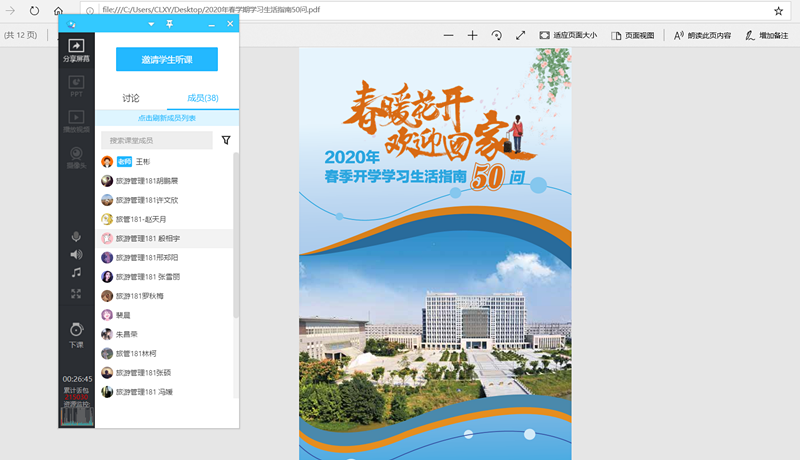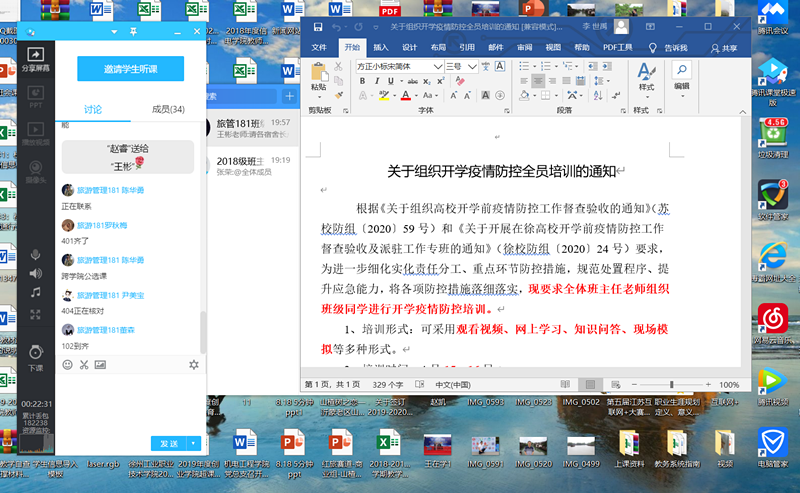 随后,各班主任通过腾讯会议、腾讯课堂、钉钉课堂、QQ视频等平台召开线上主题班会,采用观看视频、网上学习、知识问答等方式带领学生认真学习《开学第一课--防疫篇(刘向群讲述)》、《疫情防控学生学习生活指南》和《2020 年春季开学告知书》等重要内容,积极向学生宣传防疫知识,指导全体学生和家长做好开学前、返校时、开学后的各项准备和防控工作,引导学生提高责任意识,筑牢校园生命安全防线。